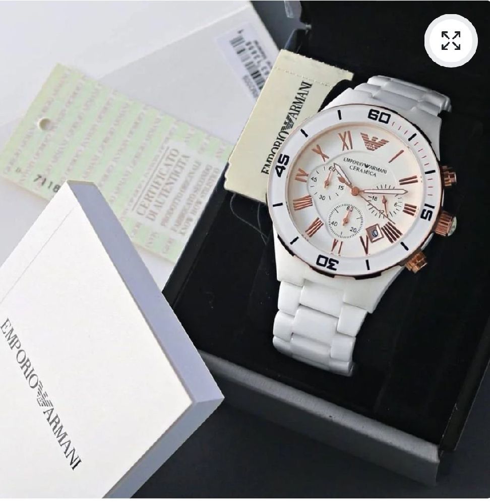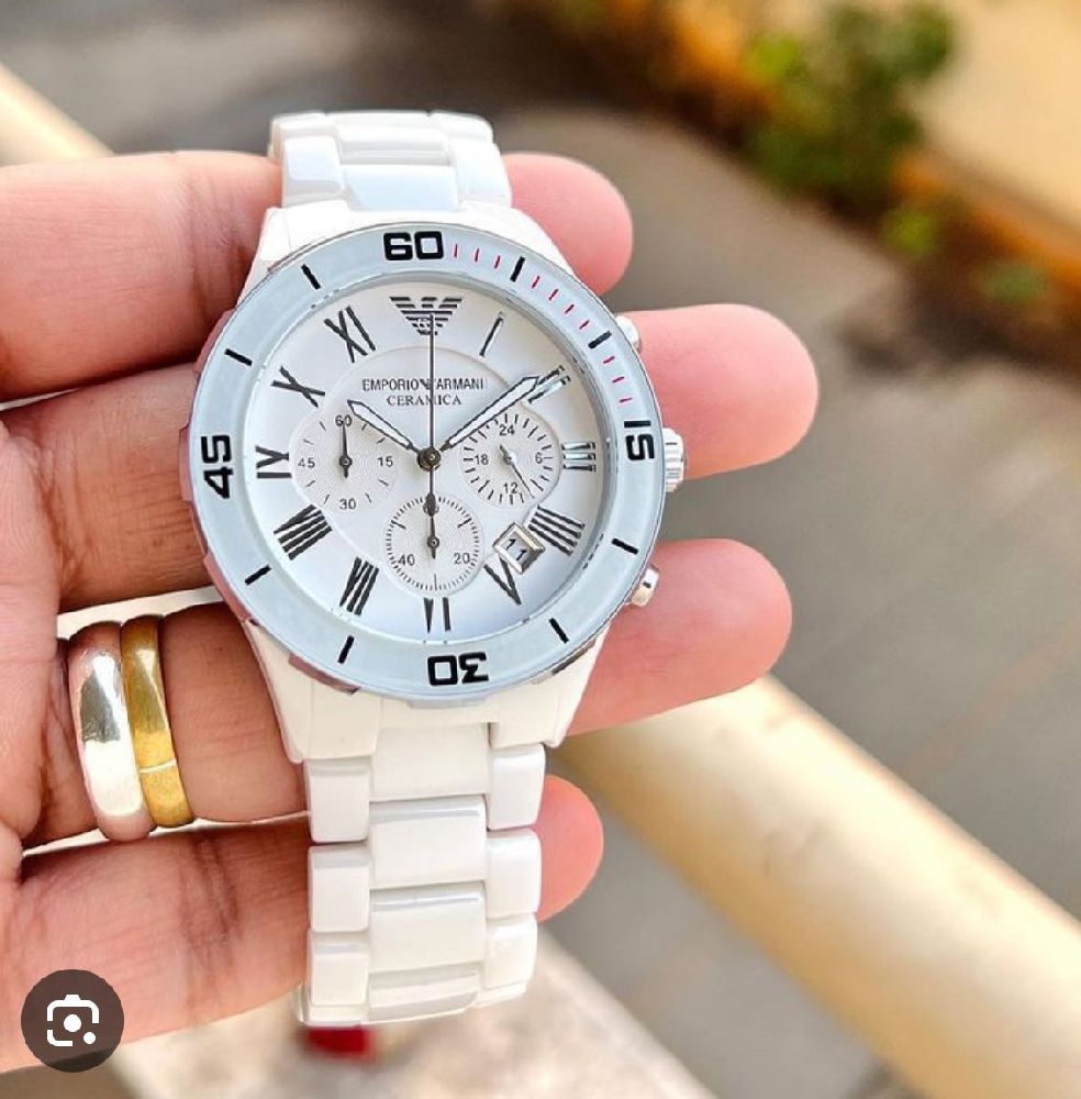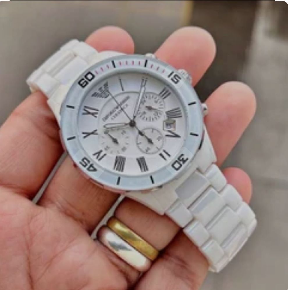 Elevate your style with the stunning Armaani white chain watch. This elegant timepiece features a sleek white dial with bold numbers, surrounded by a lustrous silver chain link bracelet. The perfect accessory to add a touch of sophistication to any outfit. Treat yourself or surprise a loved one with this chic and timeless watch.