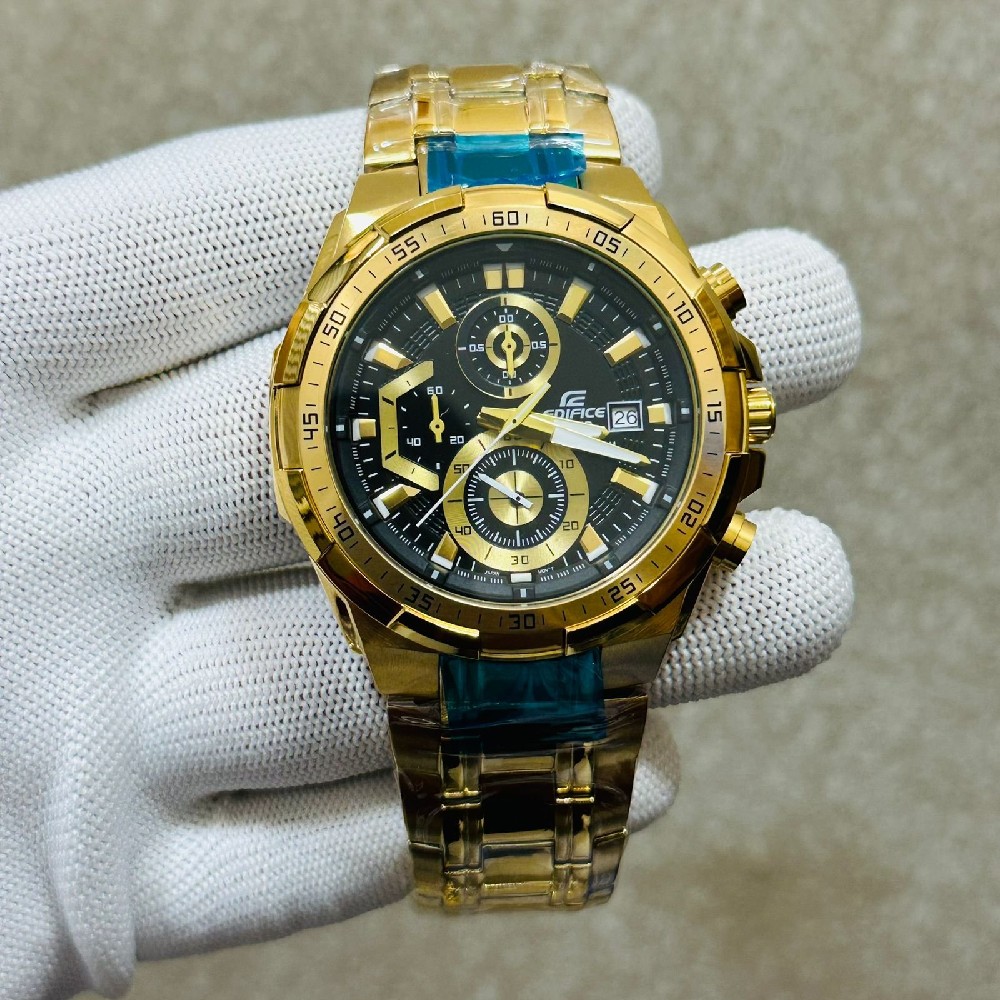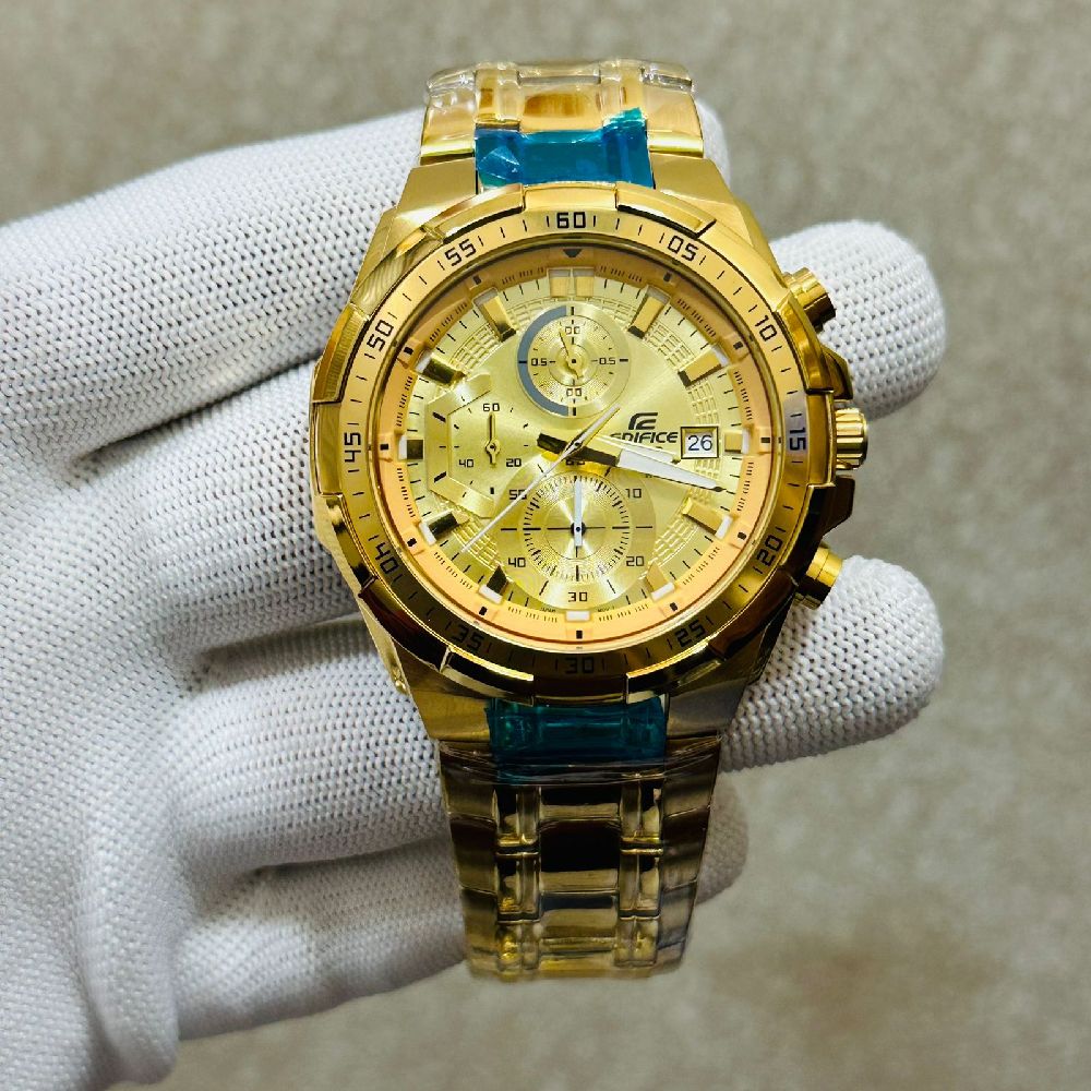 Add a touch of sophistication to your look with the Edifice Luxury Gold Link Watch. This stunning timepiece features a sleek gold link bracelet and a classic round dial with chronograph sub-dials. Perfect for any occasion, this watch is sure to make a statement wherever you go. Treat yourself or someone special to this exquisite piece of wrist wear today.